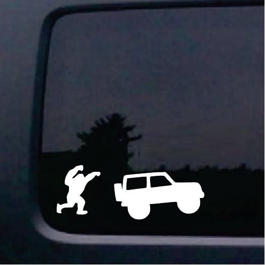 This Big Foot Chasing a Jeep Window Decal Sticker is available in a variety of sizes, colors and fonts and are made right here in America.