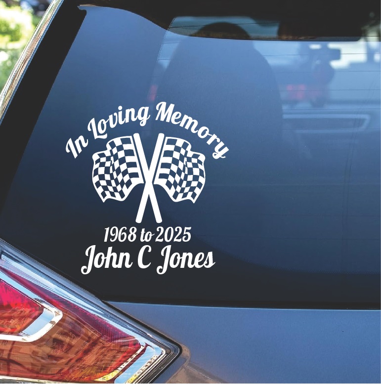 This In Memory Checkered Flag Decal Sticker is available in a variety of sizes, colors and fonts and are made right here in America.