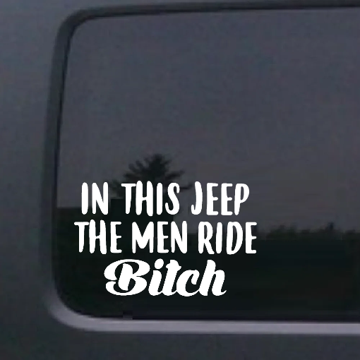 This In this Jeep the Men ride bitch Decal Sticker is available in a variety of sizes, colors and fonts and are made right here in America.