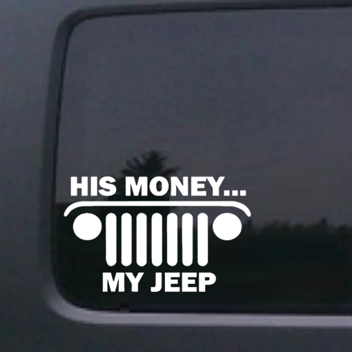 This His money My Jeep - Jeep Wrangler Decals is available in a variety of sizes, colors and fonts and are made right here in America.