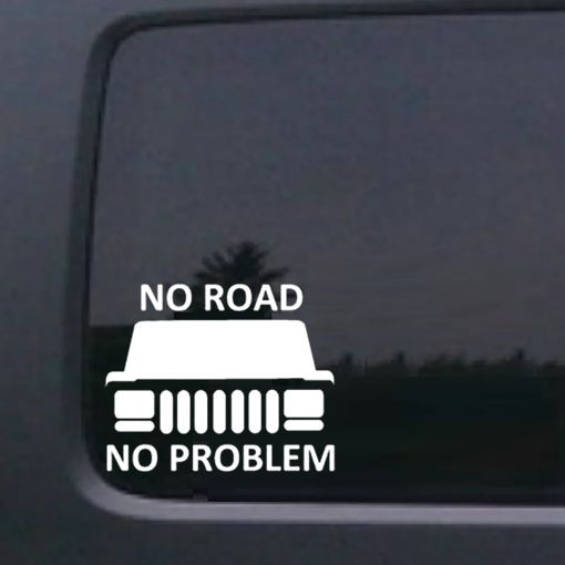 This No Road No Problem - Jeep Wrangler Decals is available in a variety of sizes, colors and fonts and are made right here in America.