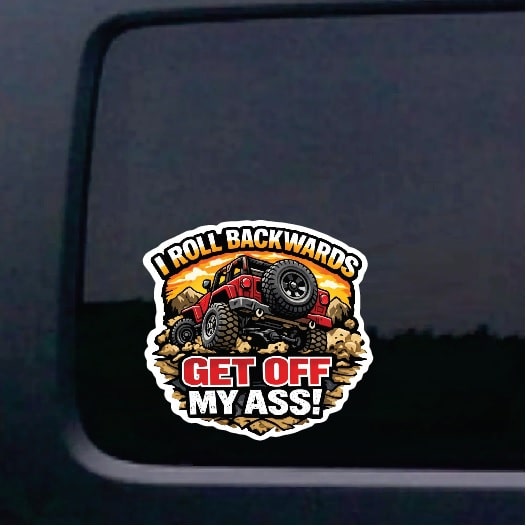 This Jeep I roll back get off my tail decal sticker is available in a variety of sizes, colors and fonts and are made right here in America.