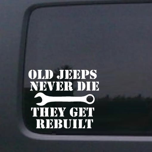 This Old Jeeps Never Die jeep decal sticker is available in a variety of sizes, colors and fonts and are made right here in America.